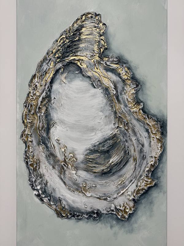 This piece presents an abstract interpretation of an oyster shell, evoking a sense of the natural world with its organic form. The composition features a central elliptical shape, outlined by a textured edge that suggests the ruggedness of underwater life. A gentle color palette of soft greens and whites creates a calming atmosphere, while hints of metallic gold accentuate the shell's contours, introducing a touch of elegance. The interplay of light and shadow enhances the dimensional quality of the artwork, inviting viewers to explore its depth. The tactile elements suggest a rich surface, drawing attention to the contrasts between smooth and rough textures. Overall, the emotional tone oscillates between serenity and intrigue, making it a captivating focal point for any space.