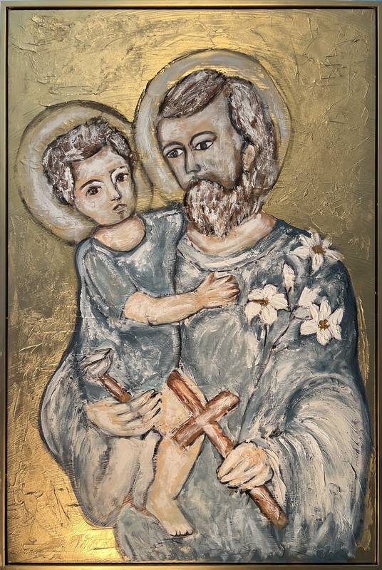 This artwork presents a poignant representation of familial devotion, St. Joseph and Jesus, while capturing the tender bond between a father and a child. The composition centers on two figures, each adorned with halos that signify their sanctity. The facial expressions convey a deep sense of care and protection, inviting the viewer into an intimate moment of connection. Color relationships are characterized by soft blues and warm golds, creating a harmonious balance that evokes tranquility and reverence. Bright floral elements introduce a lively contrast, enhancing the emotional depth of the scene. The layered, tactile surface presents a dimensional quality, drawing attention to the intricate details of the figures' garments and the gentle curves of their faces. This piece resonates with warm spirituality and an enduring sense of love, making it an evocative addition for collectors who appreciate sacred themes in contemporary art.