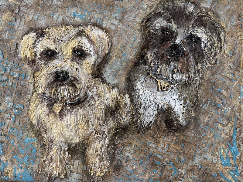 This piece features two endearing canine figures, capturing their distinct personalities through a blend of dynamic textures and a warm color palette. The composition highlights their expressive faces and soft fur, lending an inviting intimacy to the artwork. A golden hue intermingles with browns and whites, creating a structured yet layered depth that invites viewers to explore the details. The background, marked by a cooler mix of blues and neutral tones, enhances the focus on the dogs, drawing attention to their curious expressions. The tactile quality of the surface suggests a lively interaction, evoking emotions of affection and playfulness. Overall, the artwork resonates with warmth and charm, inviting admiration from viewers, particularly animal lovers and collectors alike.