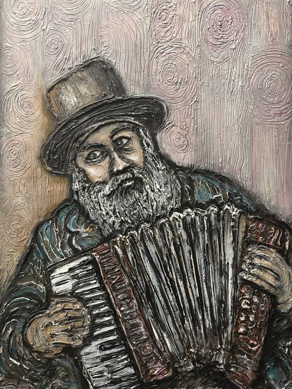 This piece depicts a figure playing an accordion, embodying a dynamic blend of expression and texture. The character's worn, weathered features and thoughtful gaze evoke an emotional resonance, suggesting a story shaped by experience and devotion to music. Vibrant color relationships accentuate the depth of character, with rich hues contrasting against a more subdued background, creating a sense of movement as the figure emerges from the canvas. The layered, dimensional surface adds a tactile quality, inviting viewers to engage closely with the details of the accordion and the figure's attire. The swirling patterns in the background echo the rhythmic movement of the music, emphasizing the connection between the subject and the art of performance. Overall, the emotional tone conveyed through the character's portrayal and the expressive composition inspires a sense of nostalgia and appreciation for the art of music, encouraging reflection on its ability to tell profound stories.